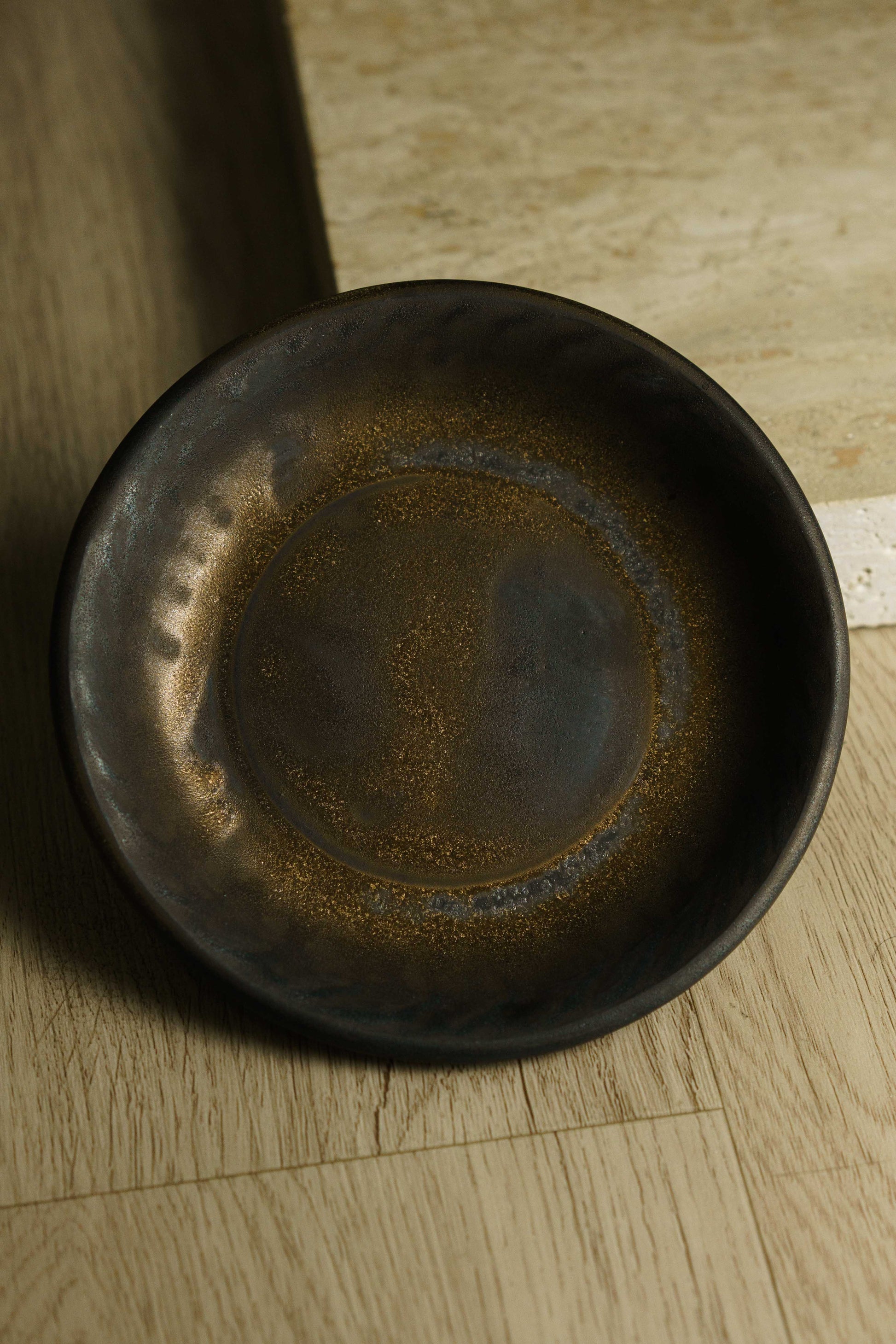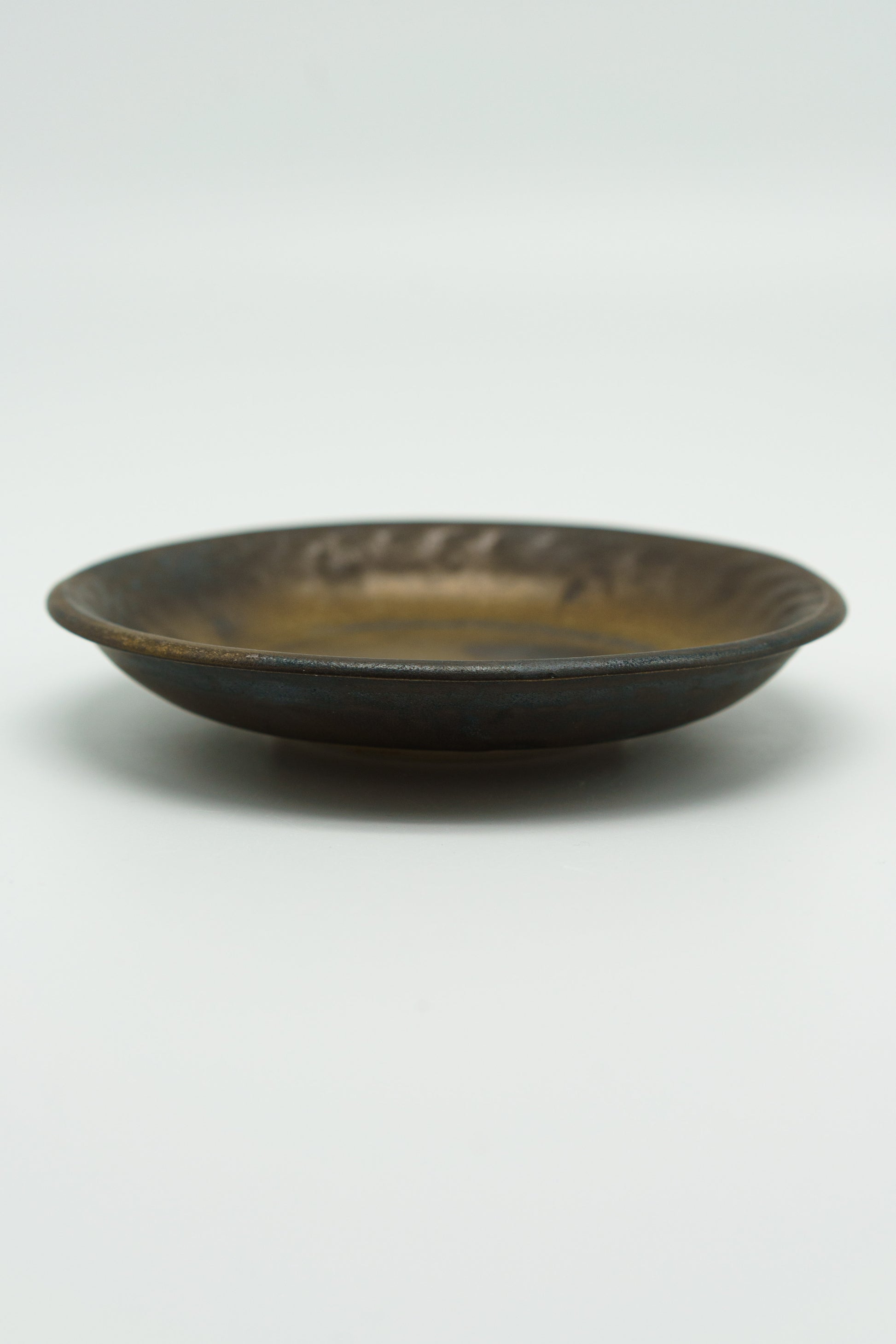 A gorgeous aged metal patina glaze perfectly complements the subtle decorations of the delicate rim and pools in its center.