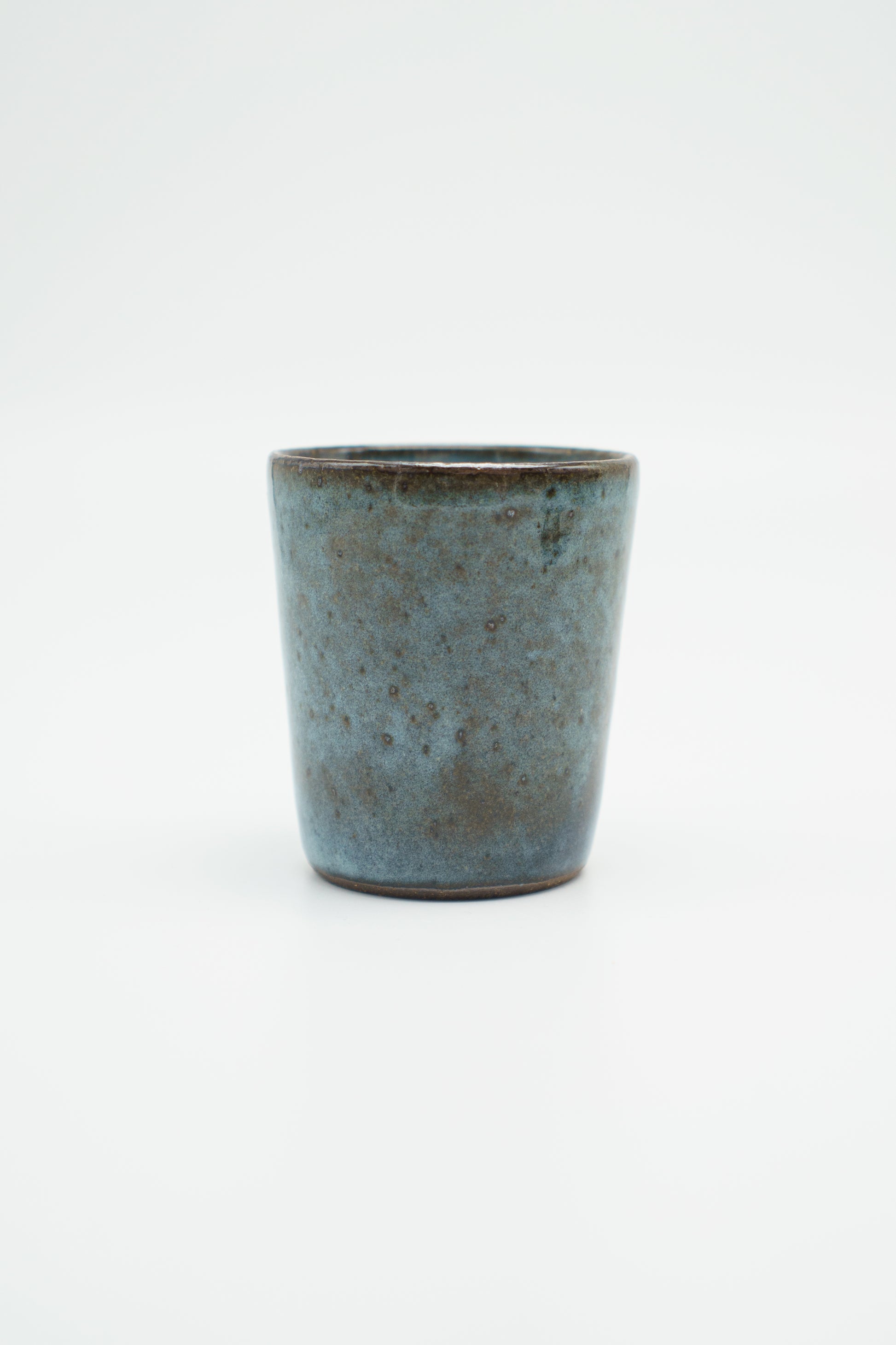 A cup with a complex icy blue glaze, set against the canvas of a dark brown clay.