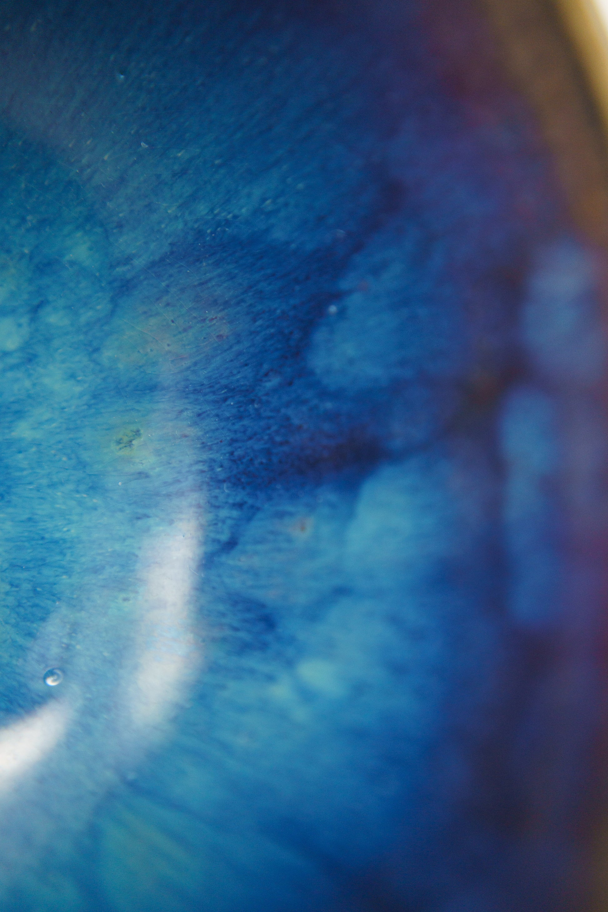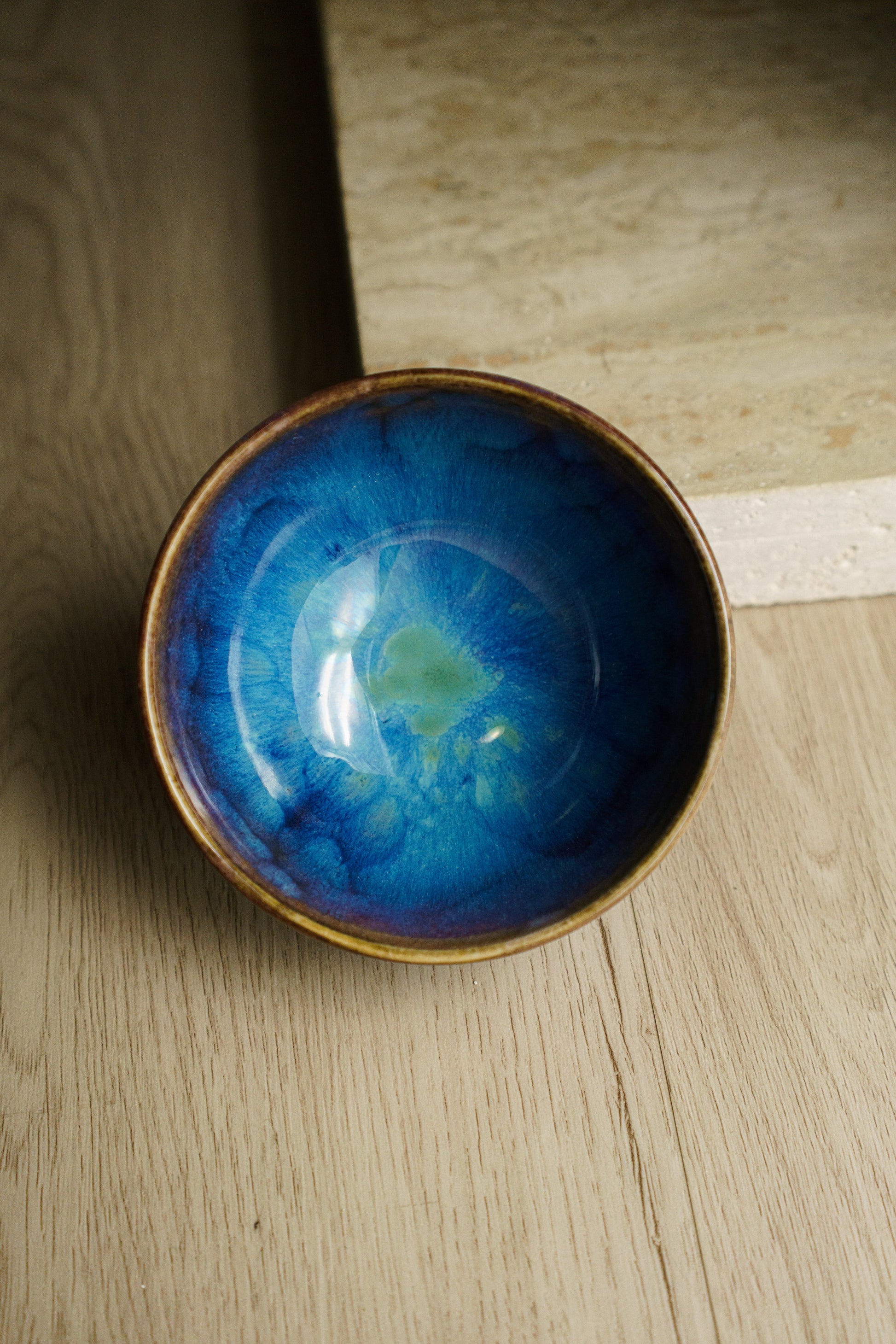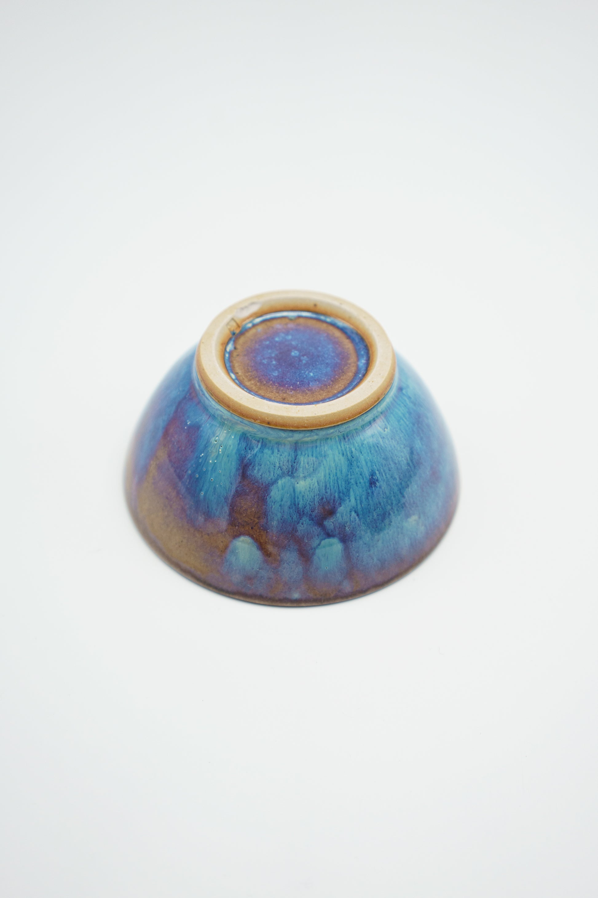 A small delicate bowl in a complex icy crackle blue glaze, perfect for ice cream or rice! Has a lil chunk of clay missing on the foot.