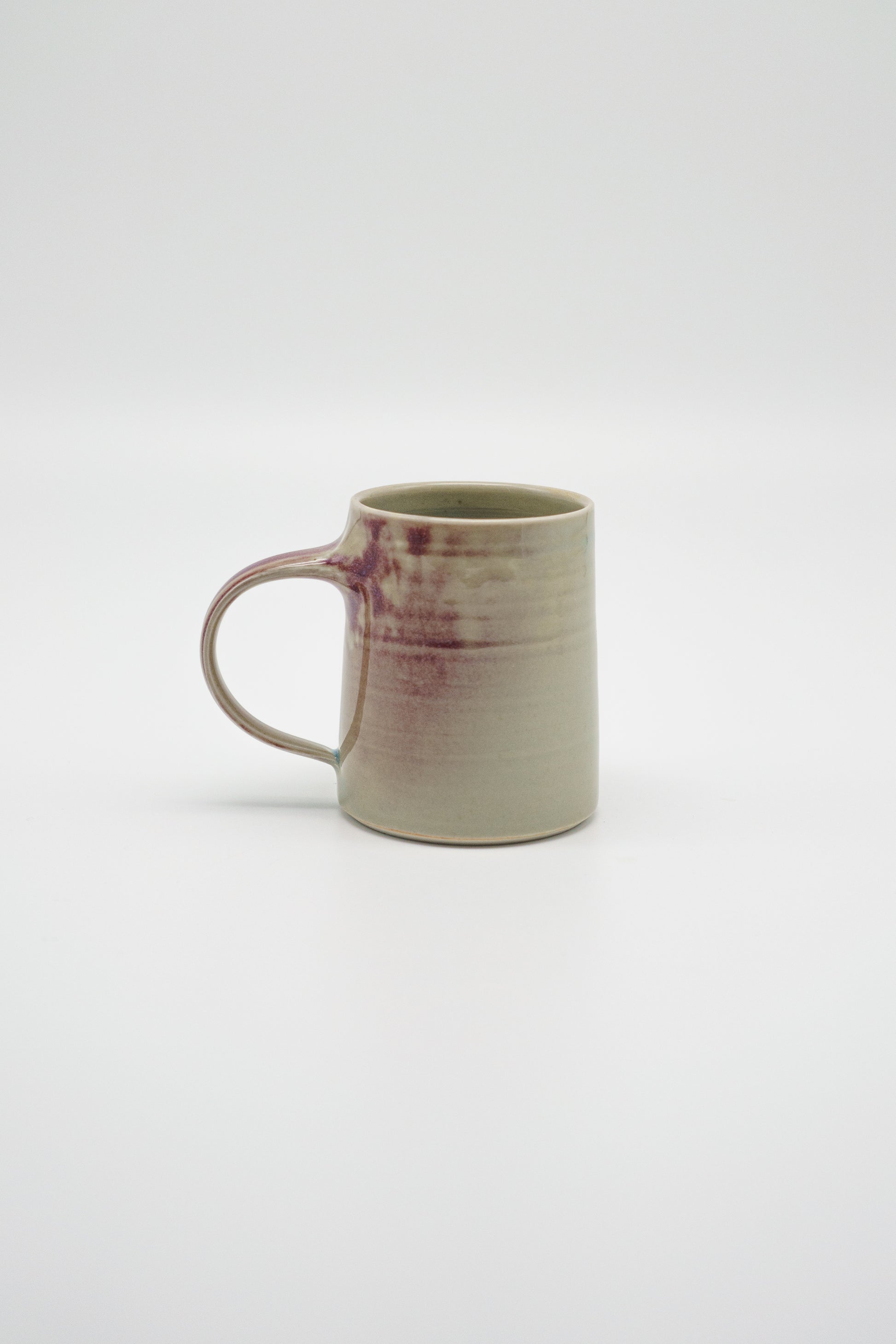 A hand thrown and trimmed mug fired in a reduction atmosphere. This tall slender mug sports a baby blue chun glaze with a pulled handle and some cranberry blush.