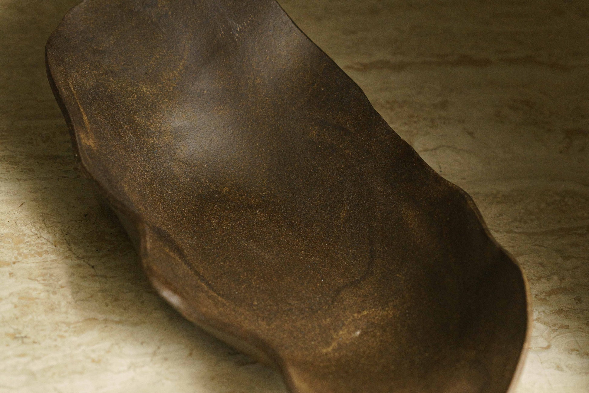 Need a statement piece? This large, stunning handbuilt oval bowl embodies a raw earthen quality, with veins of lighter brown clay shining through the dark.